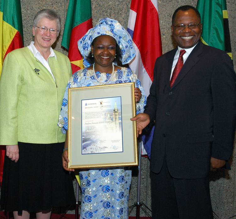| Pauline at her Fellowship graduation in May 2006 with Sheila Fraser, the Auditor General of Canada, and His Excellency Martin Mpana, the High Commissioner of Cameroon |